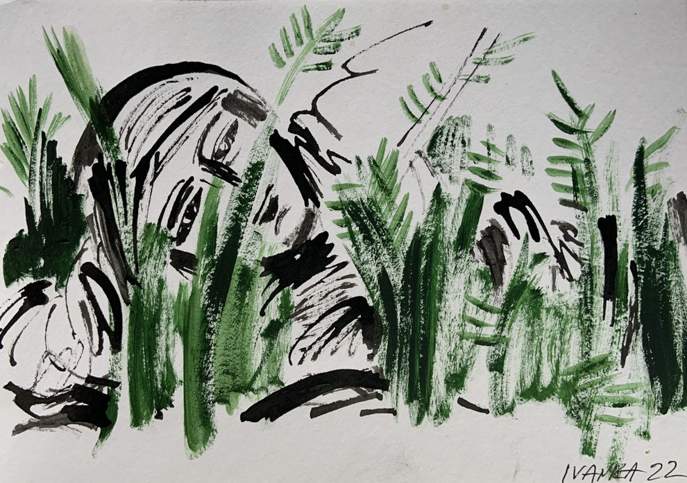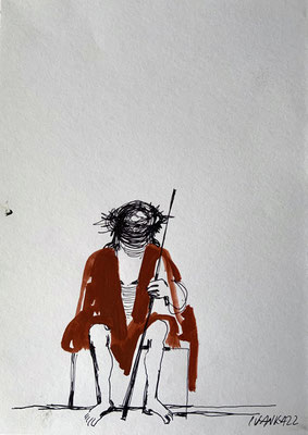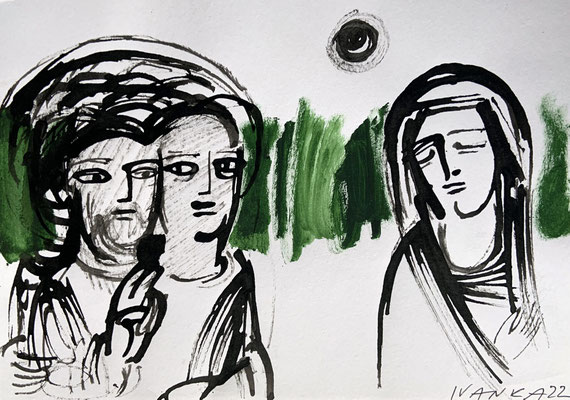 Ich habe Zeichnungen, die ich mit Tusche und einem Stift gemacht habe. Einen Pinsel brauchte ich nicht. Ich war verletzt und verängstigt wegen dem, was in meinem Land passierte: Gewalt, Vergewaltigung, Eingriffe in die Freiheit, die Zerstörung der Jugend... Jetzt gibt es eine ganze Generation von Menschen mit zerstörten Jugendlichen und zerbrochenen Träumen. Was ich damals brauchte, war ein trockener Stift und ein Stück trockenes Papier. Wenn man sich zum Beispiel in einem Keller oder einem Luftschutzkeller befindet und ein paar Tropfen Tinte oder Farbe hat, sucht man sich einfach einen trockenen Stift und zeichnet damit. Das ist so ähnlich wie die Art und Weise, wie Gefangene mit einem Nagel oder mit dem Blut ihrer Finger an die Wand malen. Diese Zeichnungen sind wie der Wunsch, ein Zeichen zu hinterlassen, eine Spur der Anwesenheit in einer Art Krise, wenn es nichts zu tun gibt. Und es endet mit dem Gedicht von Tychyna: "Ich konnte die Traurigkeit nicht ertragen, ich konnte die Qualen nicht ertragen. Ich fiel auf meine Hände und Knie und hatte die Arme verschränkt." Und da ist die Jungfrau Maria, die im Roggen liegt. Da. Sie liegt einfach da.