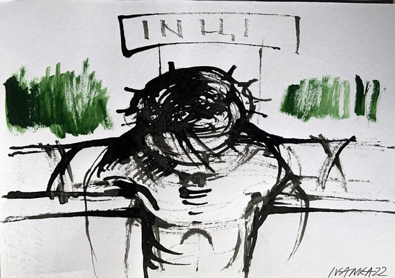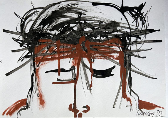 Und noch etwas: Ich habe das Gesicht Christi absichtlich sehr nah gemalt, so als ob wir uns berühren, ihm ganz nah begegnen würden. Schließlich sehen wir ihn wirklich in all diesen verletzten und verkrüppelten Menschen. Er ist ganz nah. Aber man kann ihn auch aus der Ferne sehen, wenn man ein wenig zurücktritt und auf die kleine Figur achtet. Es ist eine sitzende Figur mit gesenktem Kopf in einer Dornenkrone, einem purpurroten Mantel und einem Stock. Ich habe dieses Werk mit einem trockenen Filzstift gemalt. Ich hatte eine Menge Filzstifte dabei, einige waren schon trocken. Und man reibt den Filzstift mit letzter Kraft auf das Papier... Das sind keine neuen schicken schwarzen Filzstifte und weißes Papier. Das sind irgendwelche Reste, die man benutzt, weil es das einzige ist, was man noch hat.