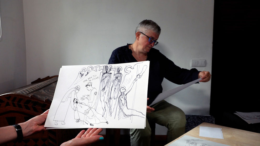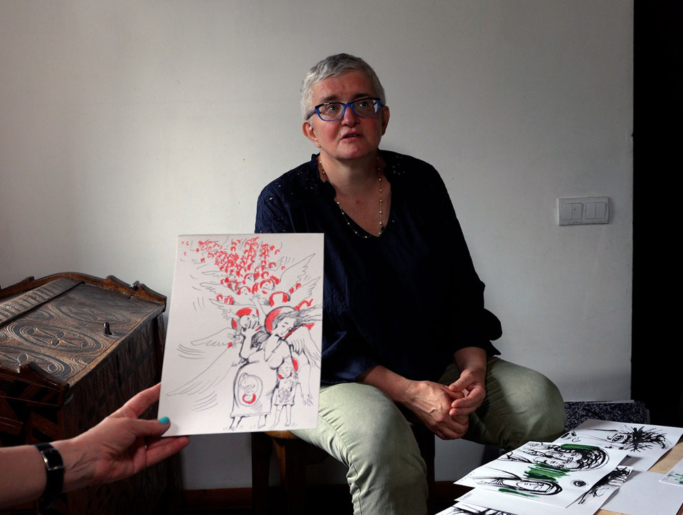 Ich habe es nicht selbst gesehen. Ich verfolge die Nachrichten nicht mehr. Aber ich kann es mir vorstellen. Ich muss es nicht mehr sehen, um es mir vorstellen zu können. Ich kann mir zum Beispiel die Situation vorstellen, in der sich Pater Ivan Danchevsky befand, denn als Artem starb, schrieb mir Pater Ivan buchstäblich 15 Minuten später: "Ich komme zu dir". Er ist extra aus Gent gekommen, um mich zu unterstützen. Und als er mich in das Flugzeug nach Krakau setzte, erzählte er mir, wie ein älteres ukrainisches Ehepaar aus Italien ihn anrief und darum bat, in die Leichenhalle in Dnipro zu gehen, um die Leiche ihres Sohnes zu identifizieren. Dies ist ein rechtliches Verfahren, jemand muss die Leiche identifizieren. Vater Ivan kannte diesen Mann, also baten die Eltern ihn. Er transportierte Krankenwagen von Belgien in die Ukraine und beschloss, nach Dnipro zu fahren, um die Anfrage zu erfüllen. Doch als er dort ankam, wurde er ohnmächtig. Er weinte und fiel in Ohnmacht. Er konnte nicht sehen, was vor ihm lag. Vater Iwan hat mir nicht erzählt, was er gesehen hat, aber ich habe es gezeichnet, als ich im Flugzeug saß. Es sind ziemlich schaurige Zeichnungen.
