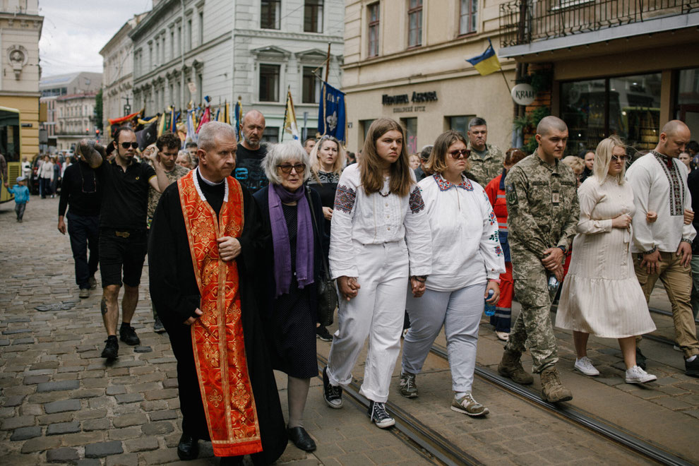 Ich lebe in der Realität des Sieges. Als ich diese Jungs sah, wurde mir klar, dass Gewinner so aussehen. Und im eigenen Land zu kämpfen ist ein Sieg. Und der Westen, die westlichen Politiker reden vom Sieg. Erstens können sie nicht verstehen, warum wir noch am Leben sind. Warum es in drei Tagen keinen Blitzkrieg in Kyjiw gab, und die [russische] Armee kaum vorrückte. Ich lebe in der Realität des Sieges. Ich lebe auch in der Realität der Auferstehung. Ich bitte die Priester immer, "Christus ist auferstanden" zu singen und nicht "Ewiges Gedächtnis". Weil ich jetzt ein bisschen nicht verstehe, was "Ewiges Gedächtnis" bedeutet, habe ich jetzt Probleme mit meinem Gedächtnis, aber ich habe keine Probleme mit der Auferstehung.