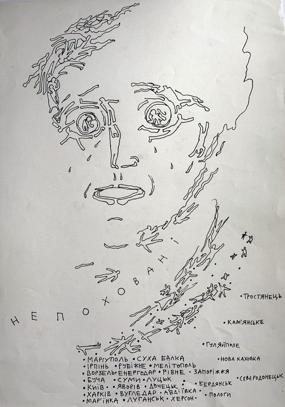 In Belgien habe ich zunächst nur von der Malerei gesprochen, weil ich sie nicht sofort ausüben konnte. Ich begann damit, meine Hand mit Text zu "bemalen". Das erste, was ich schrieb, war: "Und auf der erneuerten Erde wird es keinen Feind geben, und es wird einen Sohn und eine Mutter geben, und es wird Menschen auf der Erde geben." Dann schrieb ich viele Male das Wort "Mariupol". Ich zeichnete ein Bild der "Unbegrabenen", denn zu dieser Zeit begann die massive Zerstörung von Wohngebieten, und mir wurde klar, dass es dort viele Menschen gab, die niemals begraben oder identifiziert werden würden. So begann ich allmählich, mit meinen Zeichnungen auf die Ereignisse zu reagieren. Ich zeichnete fast jeden Tag. Dann begann ich eine ganze Serie über Tychynas trauernde Mutter, " Durch das Feld gehen".