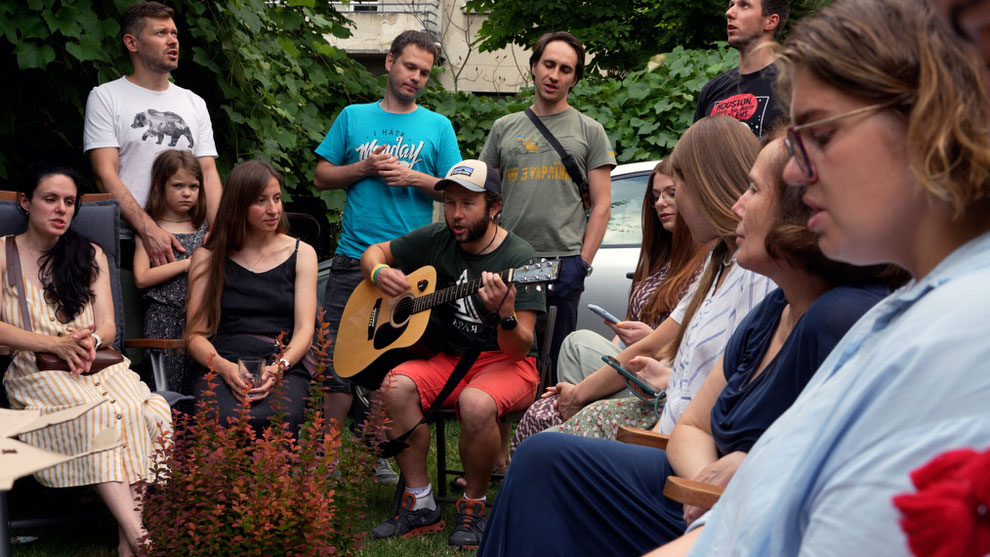 Ich plane überhaupt nichts mehr. Ich wusste, dass ich wollte, dass meine Freunde zu uns in den Garten kommen und Gitarre spielen und singen. Und genau das ist auch passiert. Eine große Anzahl von Pfadfindern-Mitgliedern kam. Es gab ein paar ältere Leute, wie meine Mutter oder Frau Roma Patykova, Nachbarn. Aber meistens waren es Leute in Artems Alter und ein bisschen älter, wie zum Beispiel Kolobok. Er war Artems Nachhilfelehrer, obwohl er nur ein paar Jahre älter war. Es war sehr schön, dass einige Leute mit ihren Kindern kamen. Die Kinder liefen im Garten herum, und das brachte viel Leben in die Bude.